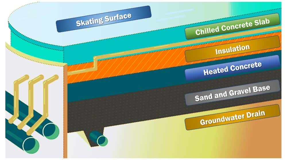 Ice Rink refrigeration systems can be one of two different types – direct or indirect. In an “indirect” refrigeration system, a liquid refrigerant absorbs heat from a secondary liquid, or brine, which then pulls heat out of a rink floor as the brine is pumped and circulated through pipes embedded evenly throughout the floor. In a “direct” system, the floor’s heat is removed by pumping the primary refrigerant directly through the floor’s pipes—there is no secondary coolant involved. Regardless of whether it is a direct or indirect system, the chilled liquid flowing through the pipes is kept at 32° F / 0° C, so that any water placed on top of the slab freezes and becomes the ice-skating surface that we see and use. A level of insulation is set beneath the concrete slab so that the ice can shrink and expand as needed.
