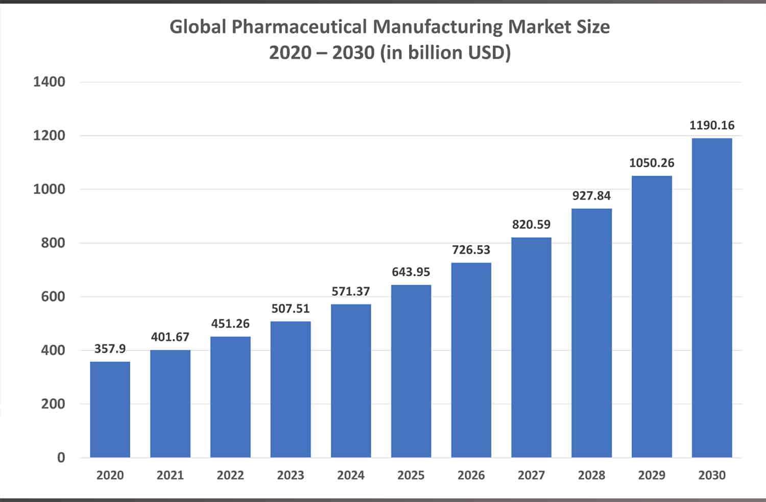 The global pharmaceutical manufacturing market revenue (which is a portion of the total global pharmaceutical revenue) came in at $357.9 billion USD in 2020 and is predicted to reach $1,190.2 billion USD by 2030, poised to grow at a robust 12.8% CAGR during the forecast period of 2021 to 2030.
