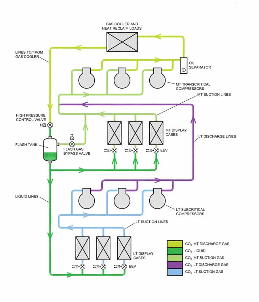 Advances in technology have made the use of environmentally friendly CO2 booster systems practical across a wide range of applications. A booster system uses only CO2 as a refrigerant. Unlike other parallel rack systems, it does not have to rely on any HFC or ammonia refrigerants. In large part, this is made possible by the function of two main components that are not found on traditional types of systems — a high-pressure control valve and a flash-gas bypass valve. In tandem with a third component, the condenser/gas cooler, which works as a condenser like the ones on most other types of systems, CO2 booster systems have become a practical, efficient alternative to traditional systems for almost any type of application in any locale.